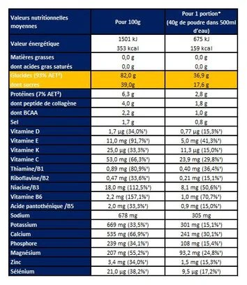 Ingredientes : Maltodextrina *, azúcar *, dextrosa *, minerales (citrato de sodio, citrato de potasio, fosfato de calcio, citrato de magnesio, sulfato de zinc, selenato de sodio), péptido de colágeno hidrolizado, fructosa, aminoácidos de cadena ramificada ramificado (L-leucina, L-isoleucina, L-valina, emulgente: lecitina de girasol), aroma natural de limón, regulador de acidez: ácido cítrico, vitaminas (C, B3, E, B6, B5, B1, D3, K1, B2). * ingredientes de Francia.