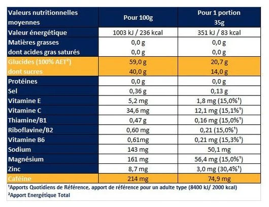 El gel APURNA® Caffeine Energy ha sido especialmente diseñado para pasajes difíciles (ascenso, aceleración) y fin de prueba. El gel APURNA® Caffeine Energy te ofrece: – CARBOHIDRATOS: para mantener su nivel de glucosa sin recurrir a sus reservas (músculos e hígado) y así prolongar la duración del esfuerzo – EFECTO POTENCIADOR gracias a su composición de cafeína para una rápida eficacia. – VITAMINAS Y MINERALES: ? Vitaminas C, E y Zinc que ayudan a proteger las células contra el estrés oxidativo ? vitaminas B2, B6 y magnesio que ayudan a reducir la fatiga ? la vitamina B1 contribuye al metabolismo energético normal Su textura líquida permite un uso sencillo durante el ejercicio. El gel APURNA® Energy Caffeine Cranberry se basa en cafeína natural, sabor natural y jugo de arándano concentrado. ¿Cuándo consumirlo? – Tomar un gel cada 45 minutos a 1 hora de esfuerzo. Recuerda hidratarte acompañando este gel con una bebida hidratante.